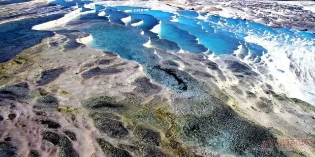 棉花堡在土耳其的纺织工业重镇Denizli,位于西南部山区,距离伊兹密尔约二百公里。此地不仅有上千年的天然温泉,更有古怪的好似棉花一样的山丘。山丘色白如棉,远看像棉花团,其实是坚硬的石灰岩地形。洁白的台阶像层层梯田依山而下,暖暖的温泉水顺着山坡潺潺流淌,平台处蓄水成塘,一汪汪湛蓝的泉水像翡翠嵌在座座白玉台上,犹如披着水衫的仙女在阳光下曼妙起舞。